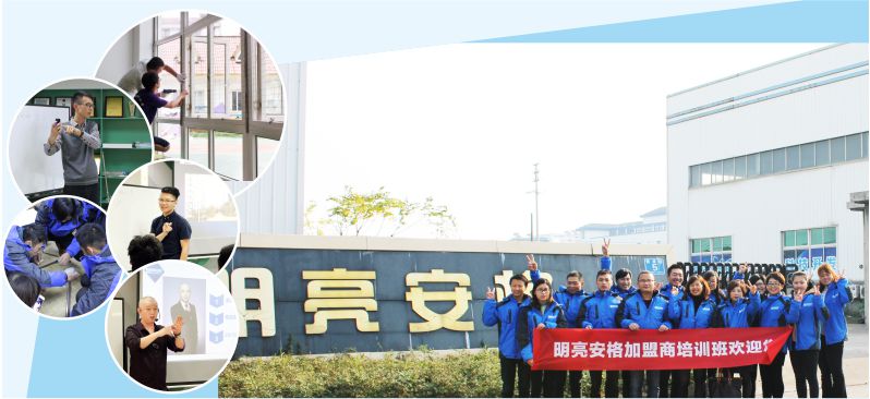 明亮安格開設(shè)培訓班,以成熟的培訓機制,特聘專業(yè)講師和優(yōu)秀加盟商為加盟商開展企業(yè)文化、產(chǎn)品知識、測量安裝、銷售技巧、活動策劃、市場推廣、渠道拓展、公關(guān)禮儀等專題培訓。