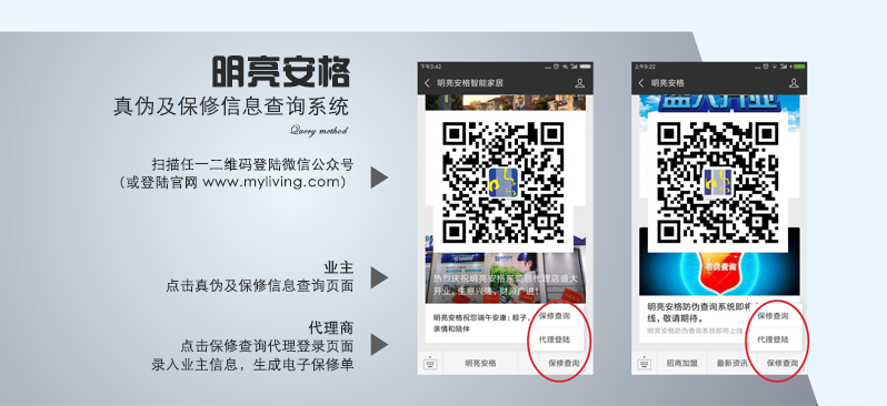 明亮安格公司緊跟時代發(fā)展,建立電子保修服務(wù)系統(tǒng),全國連網(wǎng)數(shù)據(jù)庫支持,正品保證,手機上即時錄入與查詢,讓安裝信息一目了然,可以為客戶提供更優(yōu)質(zhì)服務(wù)的同時,使客戶更有歸屬感,信任感。